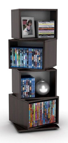 Details: Atlantic's Rotating Media Cube 216 Storage Unit's unique design incorporates four stacked cubes that rotate along a central axis for a multitude of storage and display options. With four individual compartments boasting over ten inches of clearance each, this multi-purpose storage unit is perfect for storing 216 CDs or 144 DVDs or 168 Blu-ray Discs or Games in addition to providing an ideal location for displaying photos, keepsakes and other personal effects. The unit's four individual cubes are stacked one atop another, connecting along a central axis, and allowing all but the bottom fixed cube a full 360 degree rotation. Align the cubes straight up and down, offset each, or mix and match for a variety of storage options. You can also line up a series of stands all in a row to form a larger shelving unit and exponentially increase your storage capacity. Constructed from sturdy espresso-finished composite wood with steel-rod crossbars and non-marring rubber feet, the Rotating Media Cube 216 Storage Unit ensures durability, stability, and protection for your hardwood floors. And all of the these fantastic features are complemented by the unit's distinctive rotating cube design and minimal space-saving footprint – perfect for the family room, media room, den or bedroom, adding a charming accent to any home's interior.