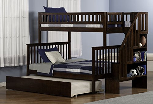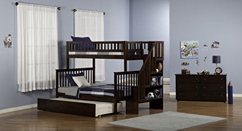 Details: Create a great space with the Woodland Bookshelf Staircase Bunk Bed. This timeless style craftsman bunk bed features beautifully detailed matching guard rails and end panels. Designed with safety in mind, you can feel good about your purchase of this bunk bed.